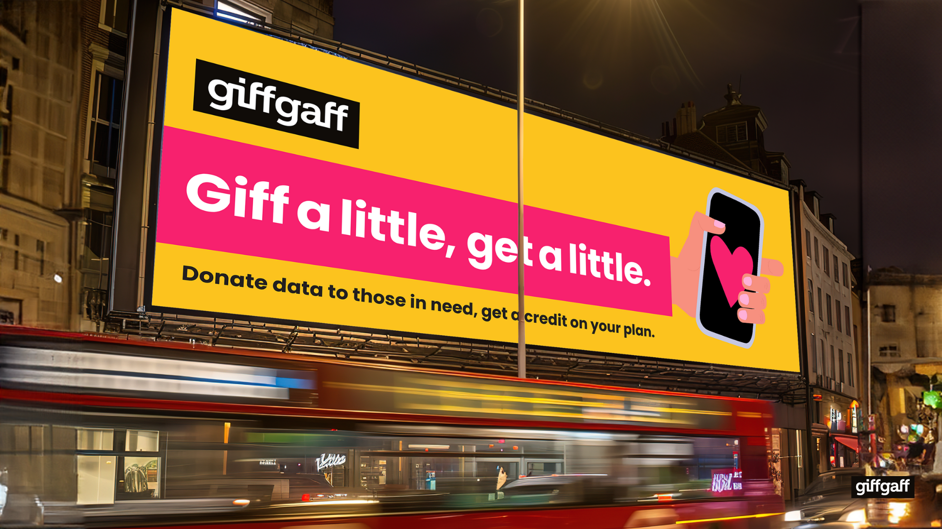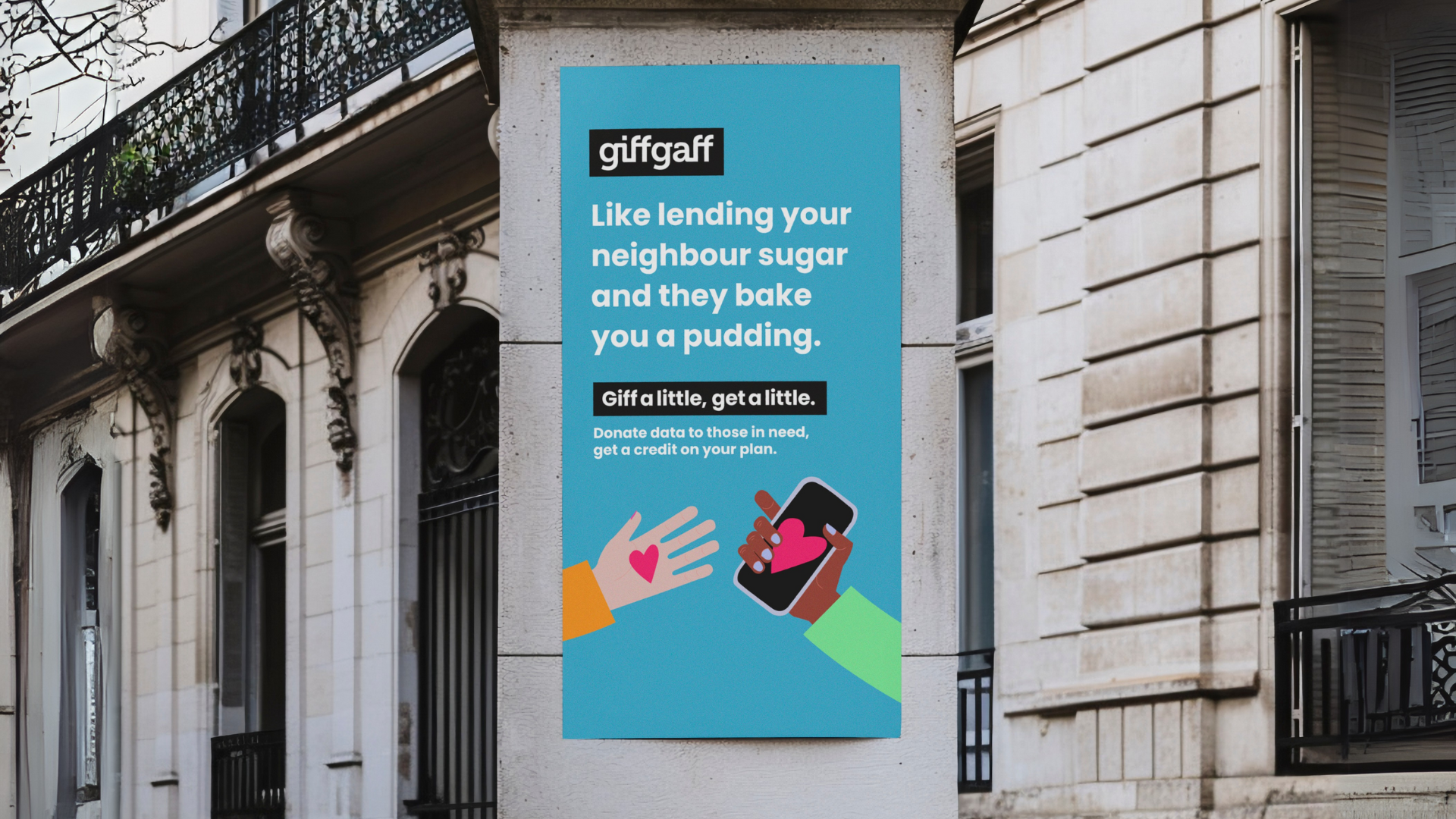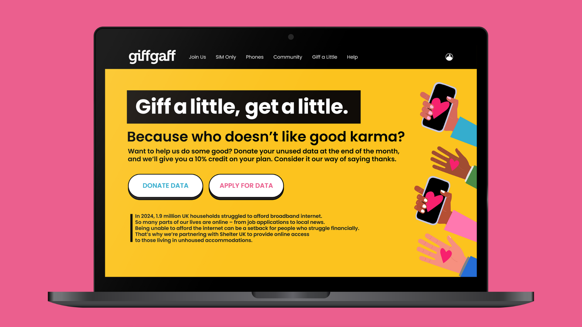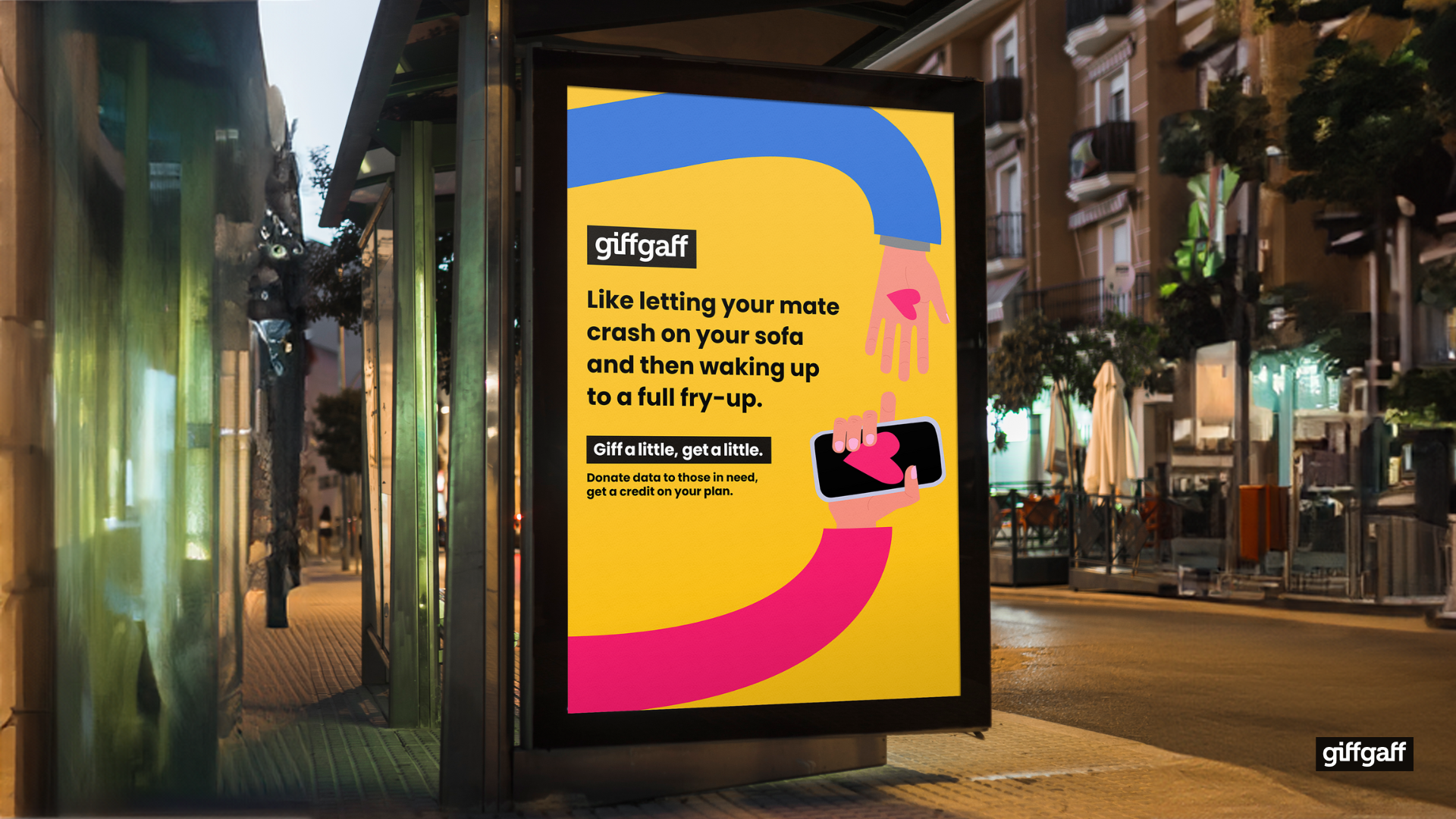 In 2024, 1.9 million UK households struggled to afford broadband internet. Low-income people are twice as likely to be offline. In an online world, digital poverty intensifies financial struggle. GiffGaff is launching #giffalittlegetalittle – Our members can donate unused mobile data and we’ll give them a credit on their plan. At GiffGaff, we know there’s no better feeling than to #giffalittlegetalittle.